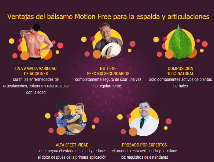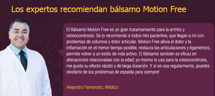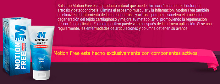 La incomodidad, la rigidez de los movimientos, el dolor en las articulaciones son signos seguros de trastornos patológicos en los tejidos que requieren un tratamiento oportuno y competente. Uno de los remedios probados más eficaces para las enfermedades de las articulaciones es Motion Free. La fórmula única de la crema se basa en 27 ingredientes naturales. El uso de este remedio lo aliviará rápidamente de un dolor insoportable, aliviará la hinchazón y la inflamación, restablecerá la movilidad articular y lo devolverá a una vida plena. Miles de pacientes ya se han convencido de que el fármaco funciona.